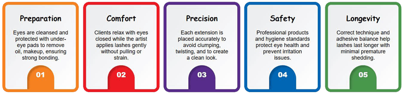 A professional eyelash extension application follows a precise and controlled process to ensure safety and consistency.